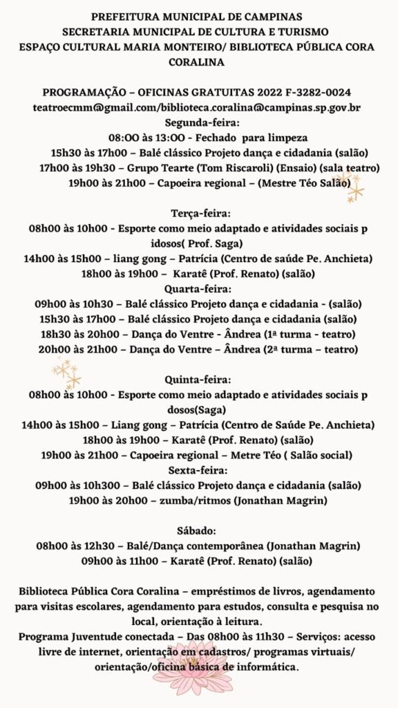 O Espaço Cultural Maria Monteiro, vinculado à Secretaria Municipal de Cultura de Campinas, está divulgando sua Programação das Oficinas. Quase todas as oficinas já iniciaram e estão com vagas disponíveis.