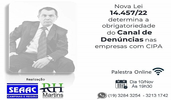 O SEAAC Campinas e Região vai realizar nesta quinta-feira, dia 10 de novembro, a palestra online e gratuita sobre a Lei 14.457/2022, que determina a obrigatoriedade do Canal de Denúncias nas empresas com CIPA e Institui o Programa Emprega + Mulheres. O link para acesso no dia agendado é: https://us04web.zoom.us/j/77059712571?pwd=N3iUyXlZTEh3Xcm1KuwSaDICml5ags.1 .